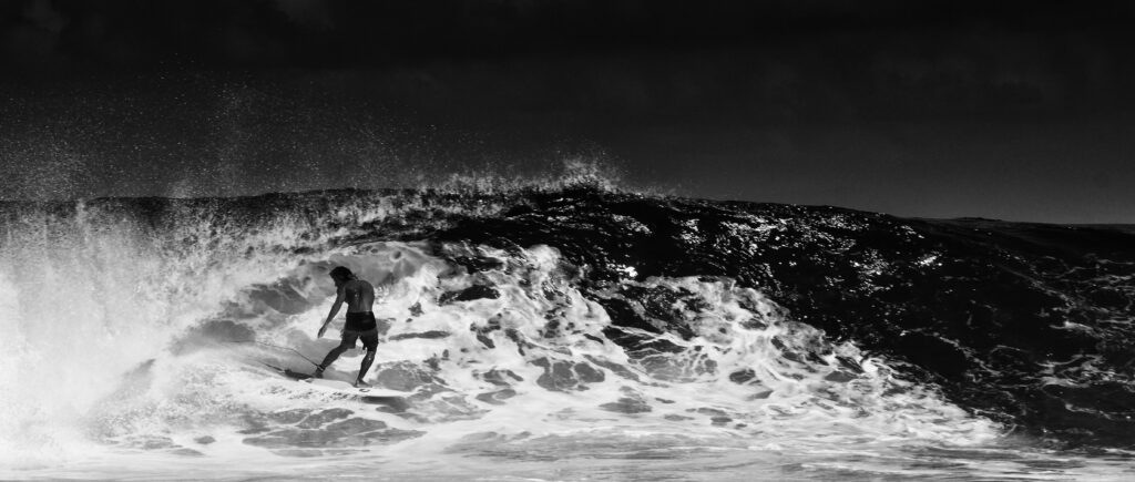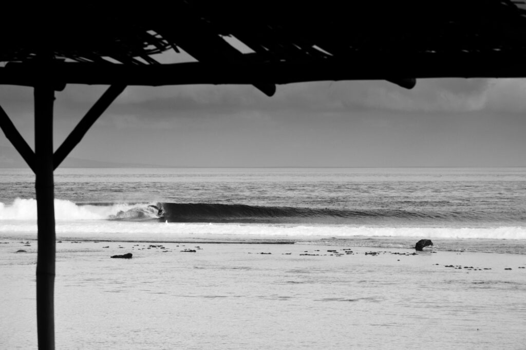 Le Chevy garé, Bill saute dans son short, enfile un lycra et court vers le line up, sa planche sous le bras. Belle prend le temps de dérouler la toile, depuis le toit de leur van jusque sur des piquets – en journée un peu d’ombre ne fait pas de mal – et prépare un apéritif bien mérité après tant de kilomètres parcourus. La session attendra, la houle n’est prévue à la baisse. Leur vieux chien, Virgule, aurait dû sortir du coffre depuis un bout de temps.